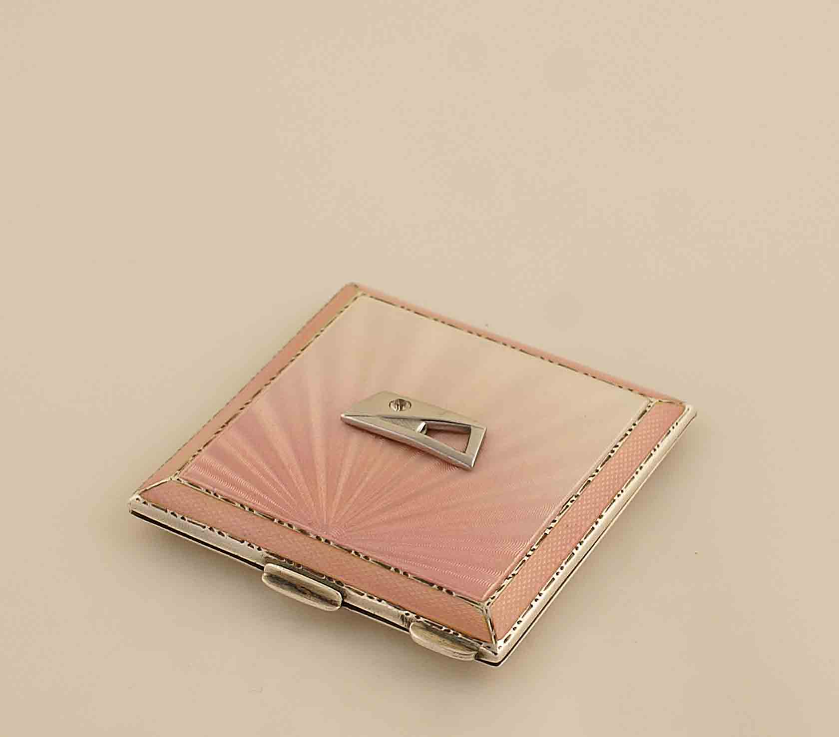 Scatola portacipria di forma quadrata in argento e smalto policromo guillochè nella tonalità del rosa con specchio all'interno, primi anni del XX secolo, cm. 7.