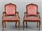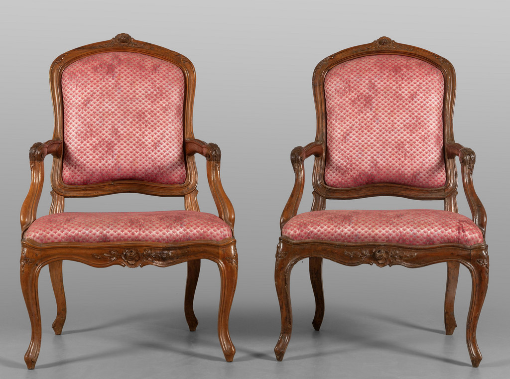 Coppia di poltrone Luigi XV in noce intagliato con pellacce sul fronte e sui braccioli Genova metà sec.XVIII
