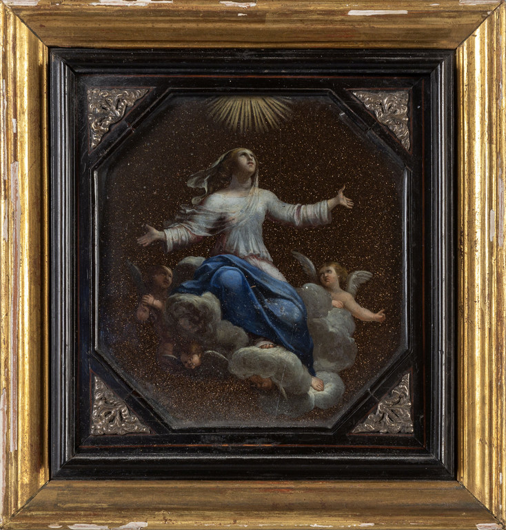 'L'Assunta con angioletti' olio su avventurina sec.XVII cornice coeva in ebano e argento (cm.16x17) contornata da un'altra cornice in legno dorato del sec.XIX