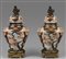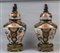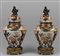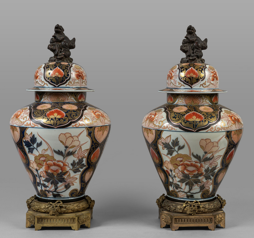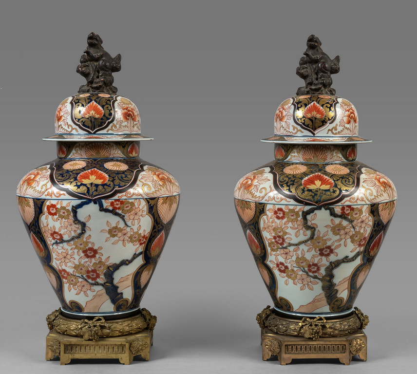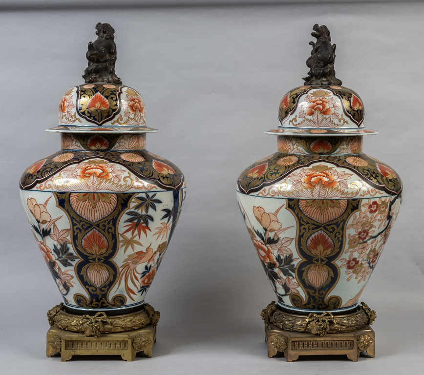 Coppia di potiches in porcellana Imari decorate a fiori prese con cani di Pho poggianti su basi coeve in bronzo dorato sec.XIX