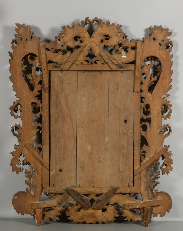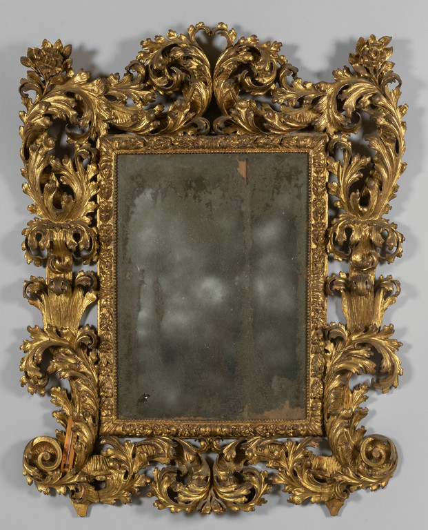 Grande specchiera Luigi XIV in legno intagliato e dorato a grandi volute Italia Centrale inizi sec.XVIII