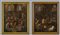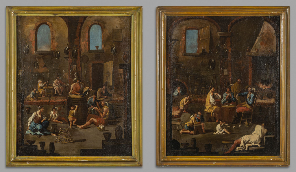 Scuola genovese sec.XVIII 'Interni di fucina con figure intente ad ammaestrare una gazza' coppia di olii