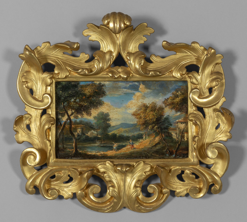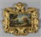Cornice in stile Luigi XIV in legno intagliato e dorato a grandi volute sec.XIX all'interno dipinto su tavola raffigurante paesaggio