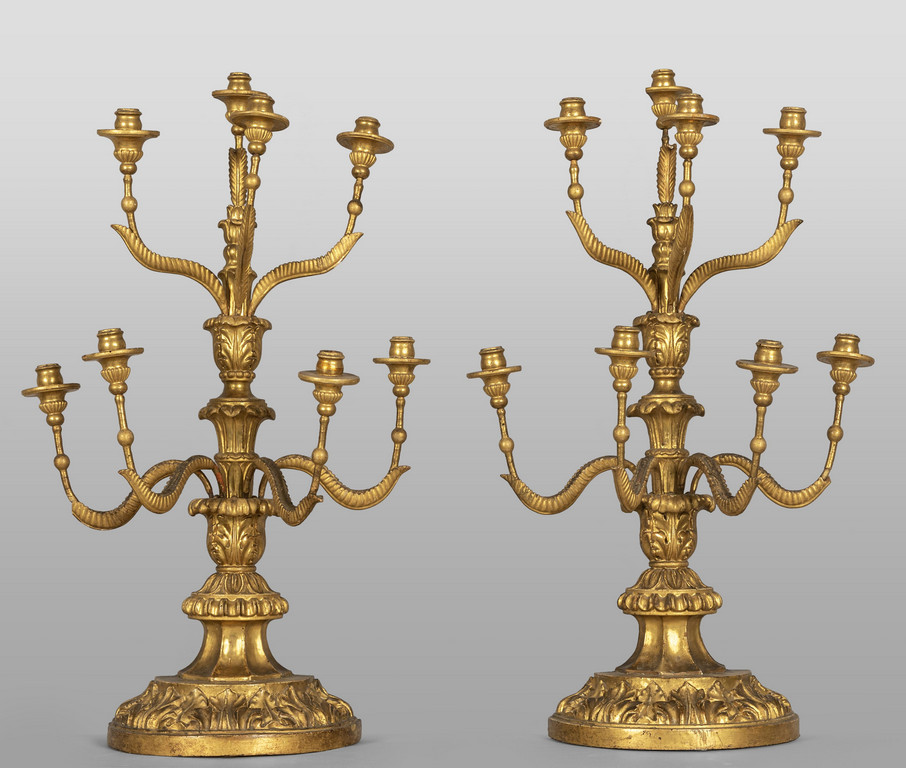 Due candelabri in legno intagliato e dorato a otto bracci fine sec.XVIII
