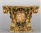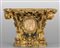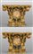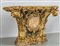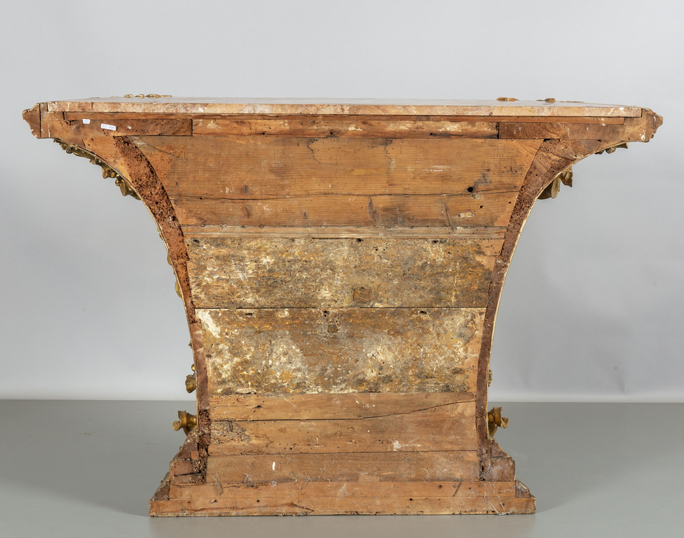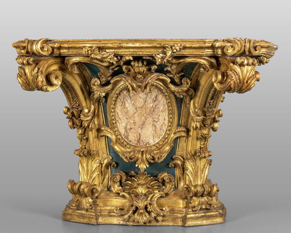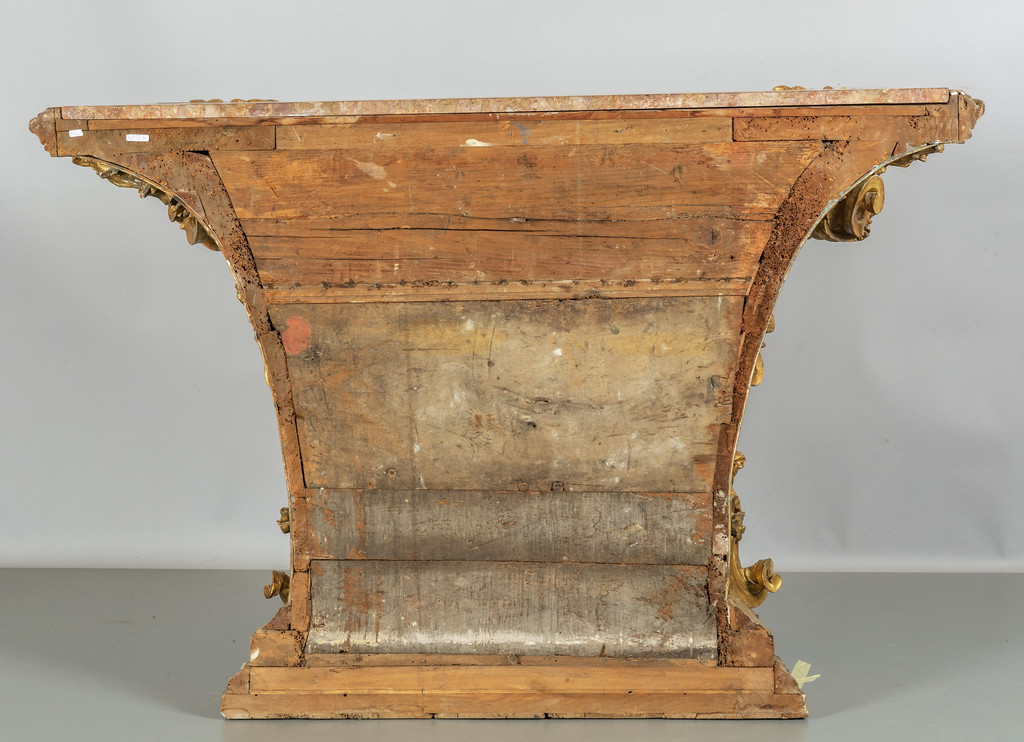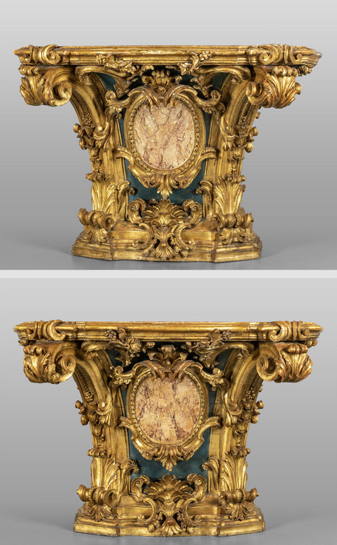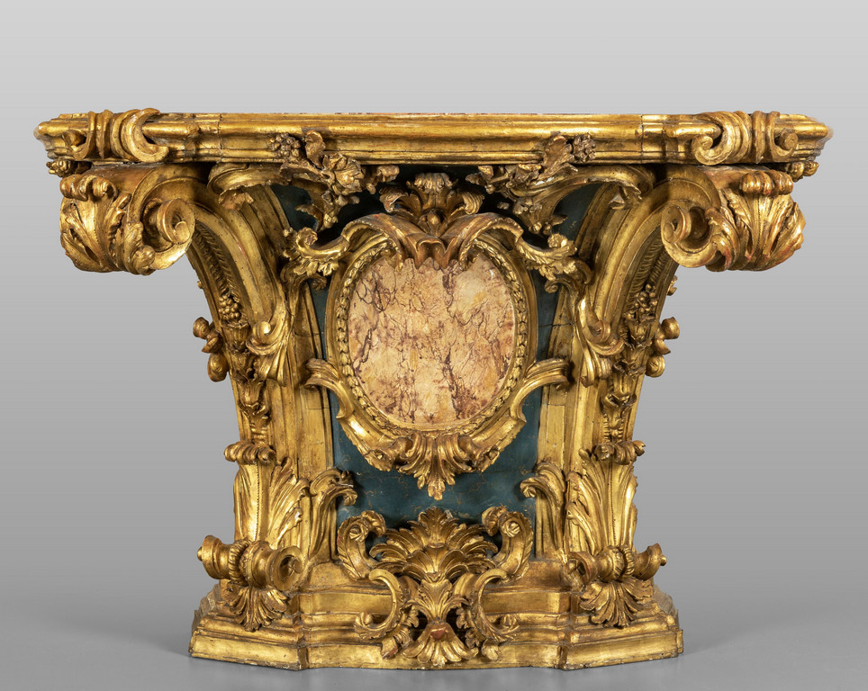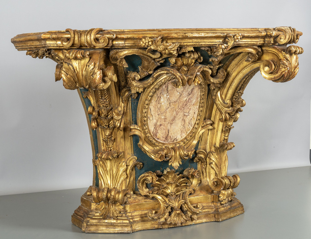 Coppia di importanti consoles in stile Luigi XIV in legno intagliato dorato e laccato parte centrale con medaglione in legno laccato a finto marmo piano in breccia