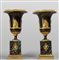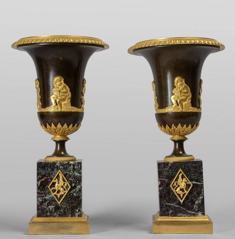 Coppia di vasi medicei in bronzo brunito con decorazioni in bronzo dorato basi in marmo verde Alpi sec.XIX