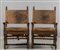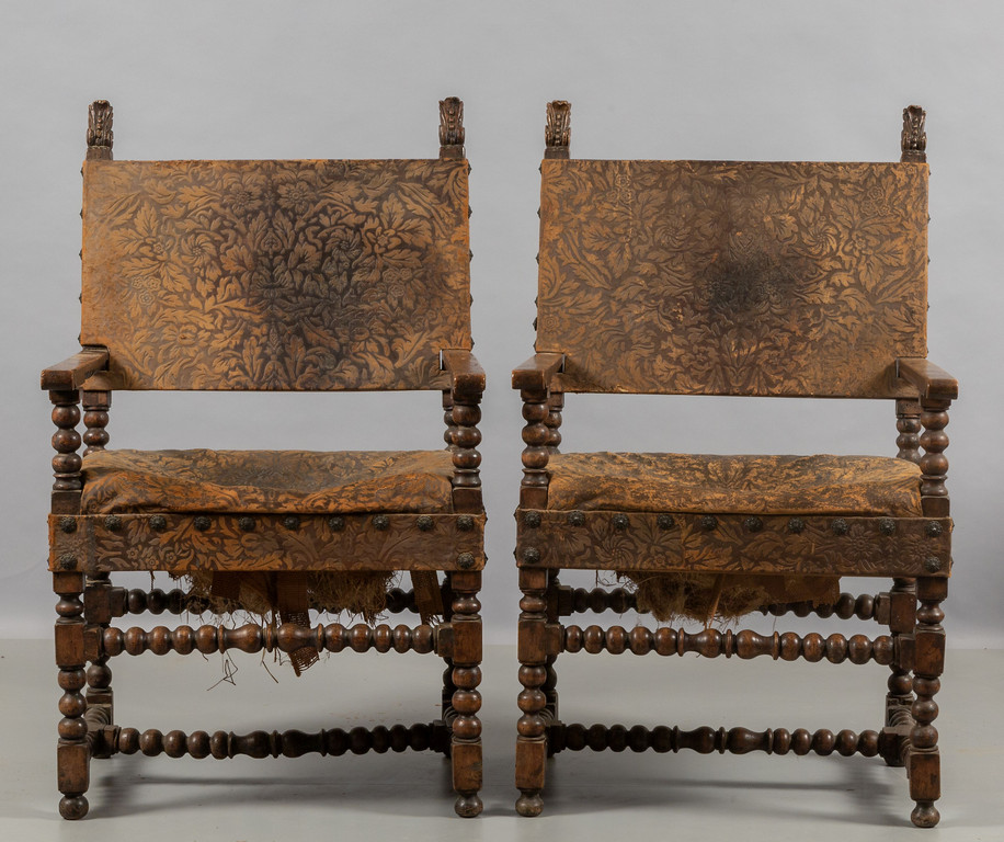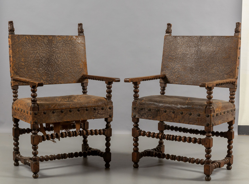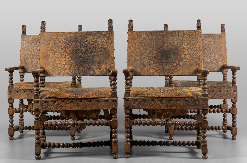 Quattro poltrone a rocchetto in noce con seduta e schienale in cuoio impresso Genova sec.XVIII