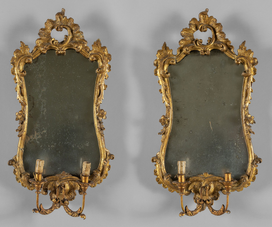 Coppia di apliques Luigi XIV in legno intagliato e dorato con braccetti in ferro Emilia sec.XVIII
