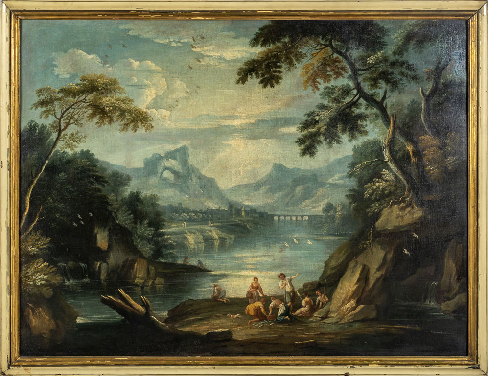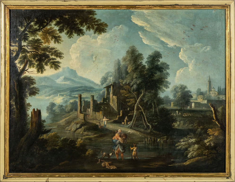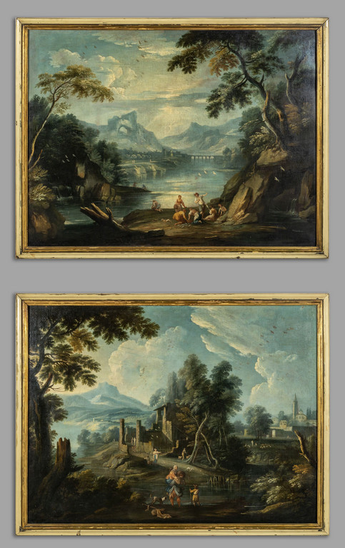 Scuola veneta sec.XVIII 'Paesaggi animati con figure' coppia di olii