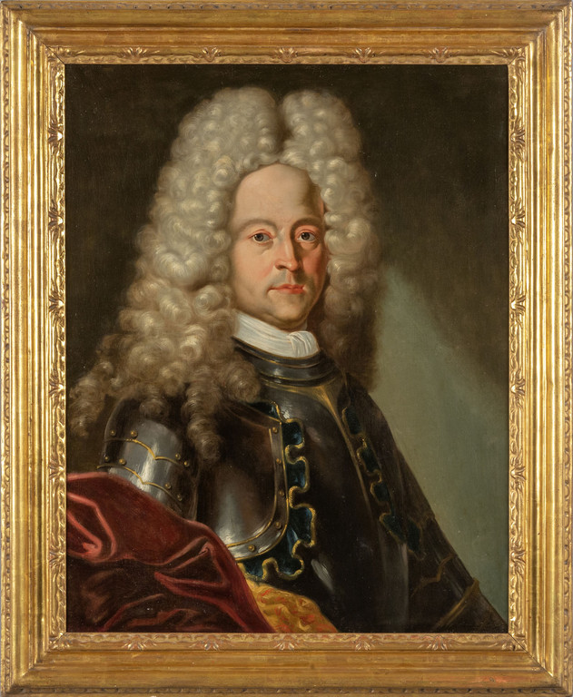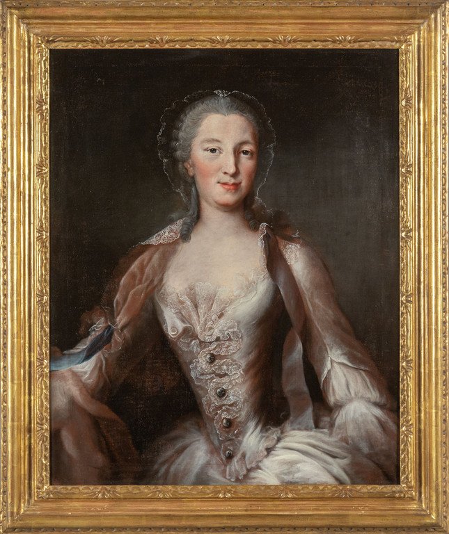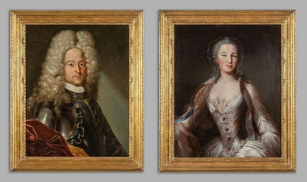 Scuola veneta fine sec. XIX 'Gentiluomo con parrucca' e 'Gentildonna con abito di gala' coppia di olii