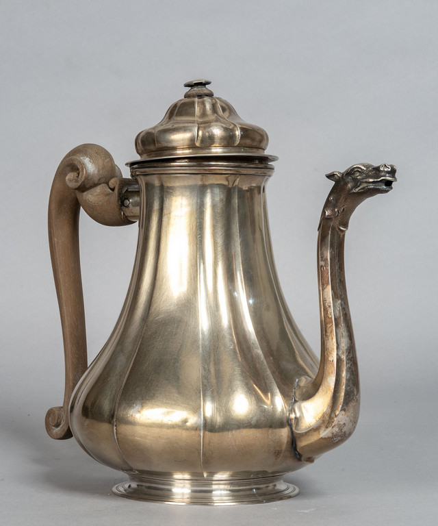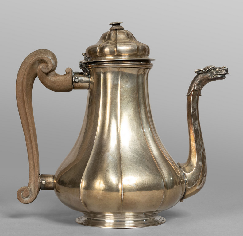Caffettiera Luigi XIV in argento corpo a nervatura verticale manico in bosso beccuccio a testa di drago Genova punzone della Torretta ripetuto nel corpo e nel coperchio I metà sec.XVIII