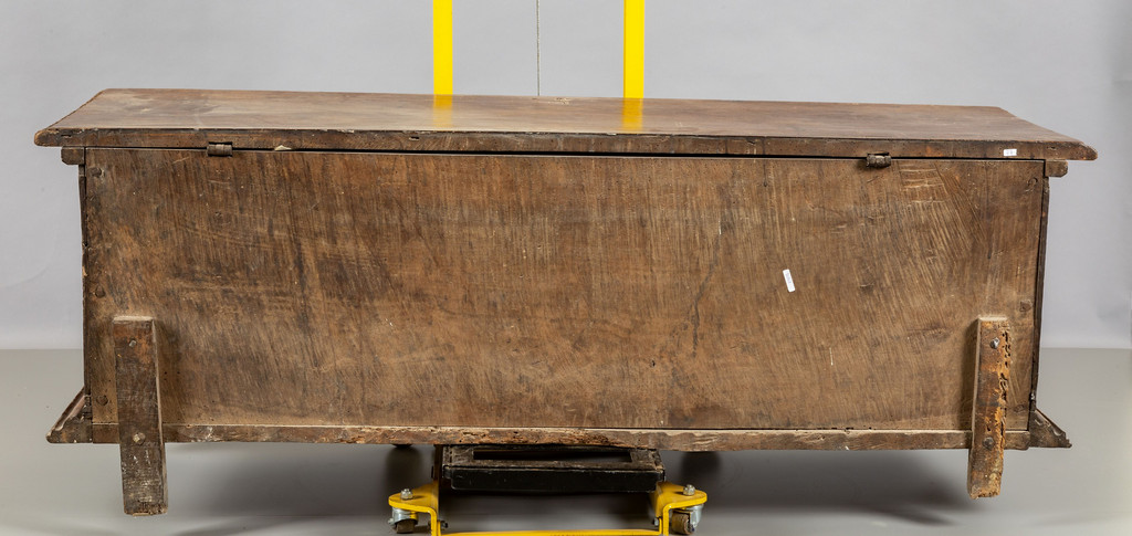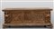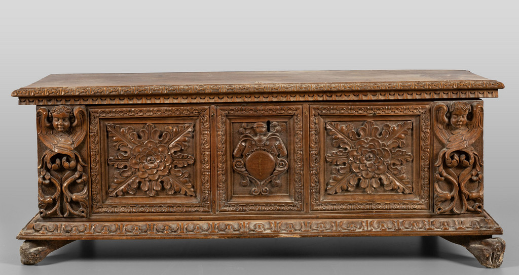 Cassapanca in noce parte frontale tripartita intagliata con stemma centrale e angeli ai lati Toscana sec.XVII