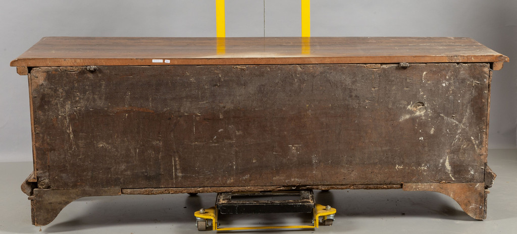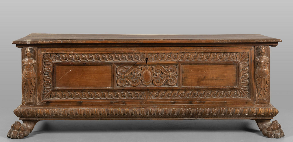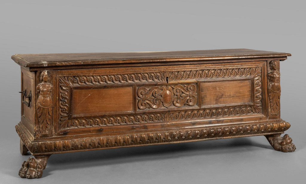Cassapanca in noce frontale intagliato con stemma centrale e bambocci ai lati Toscana sec.XVII