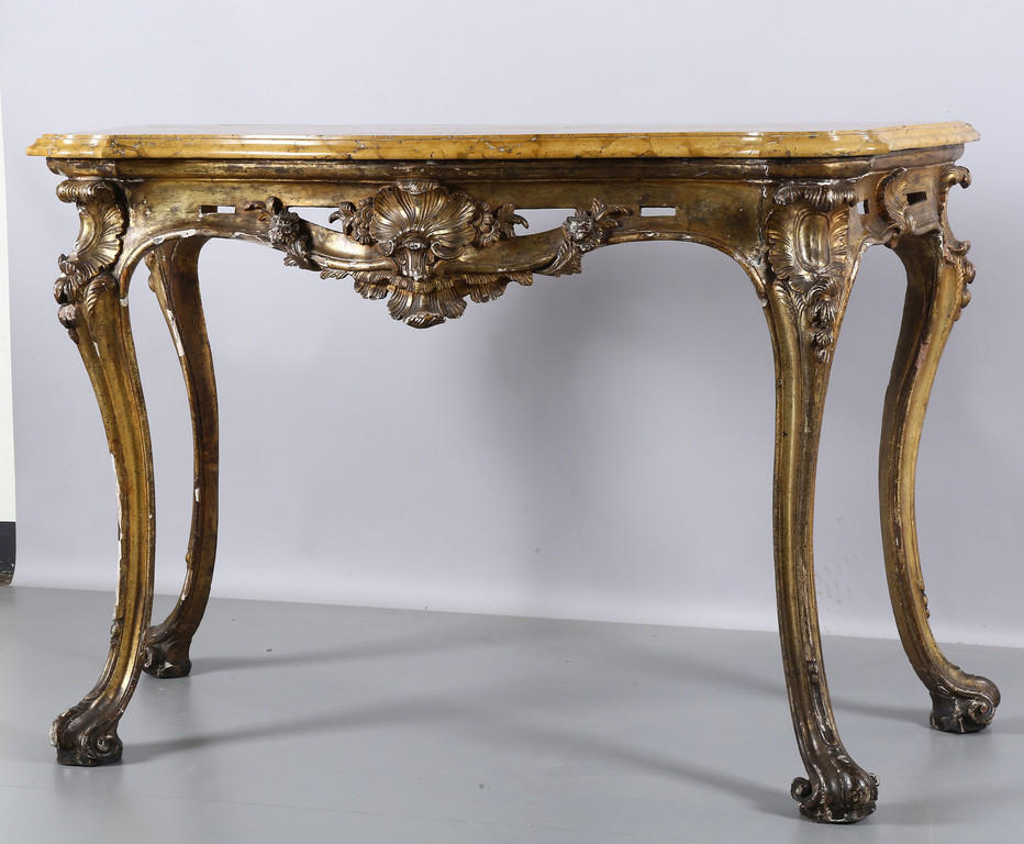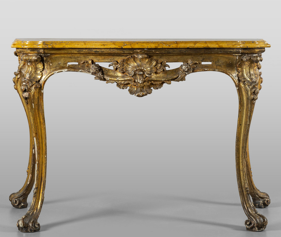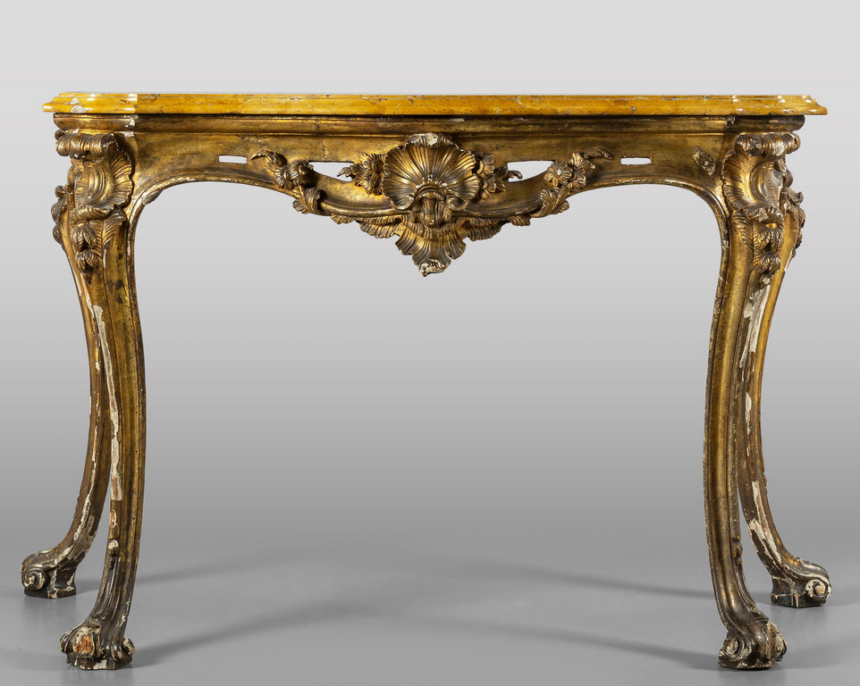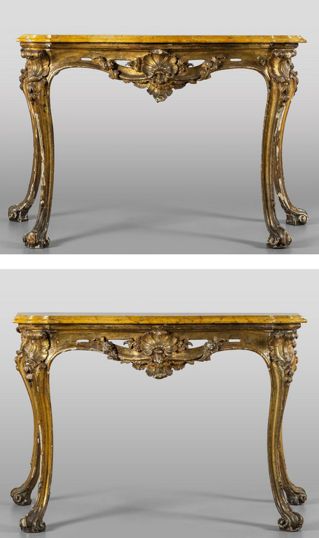 Coppia di consoles in legno intagliato e dorato piani coevi in breccia gialla Napoli I metà sec.XVIII
