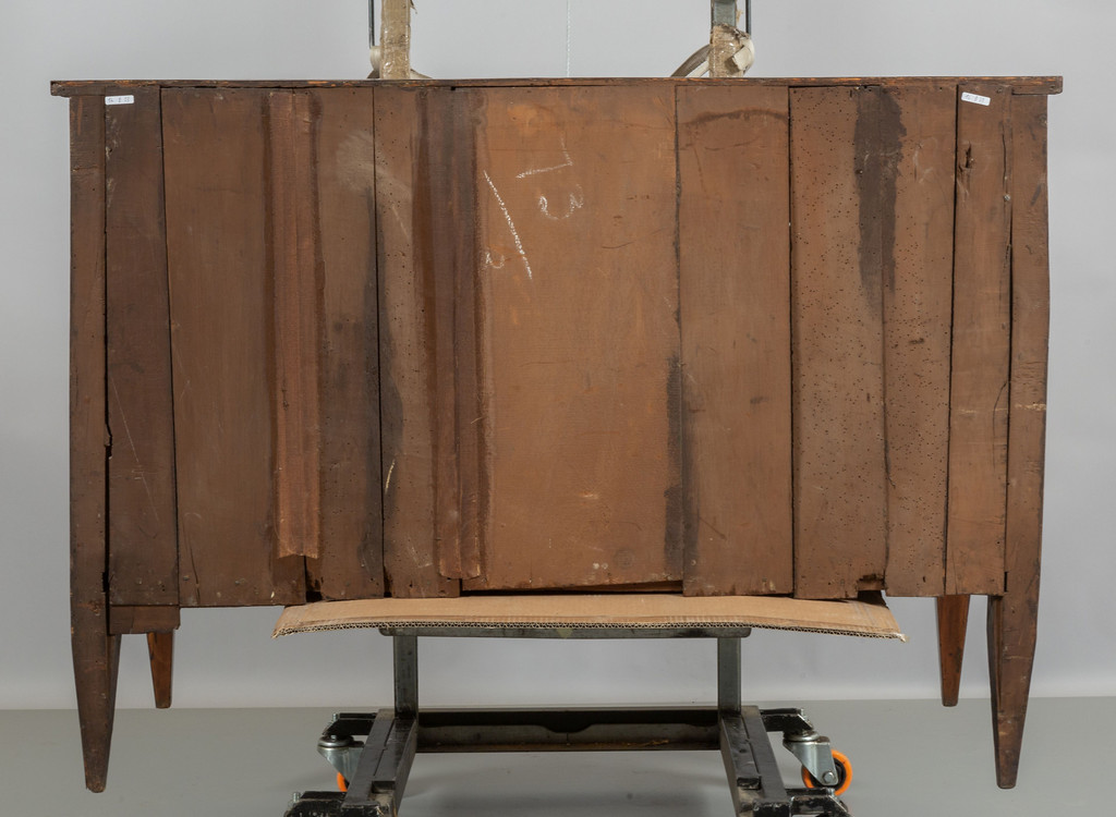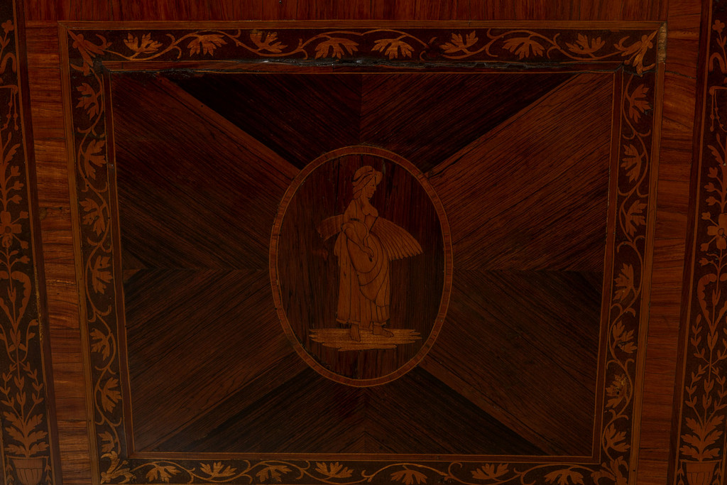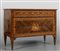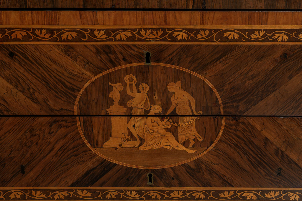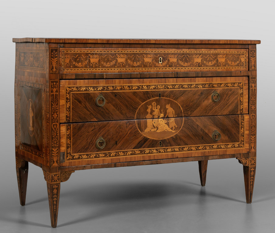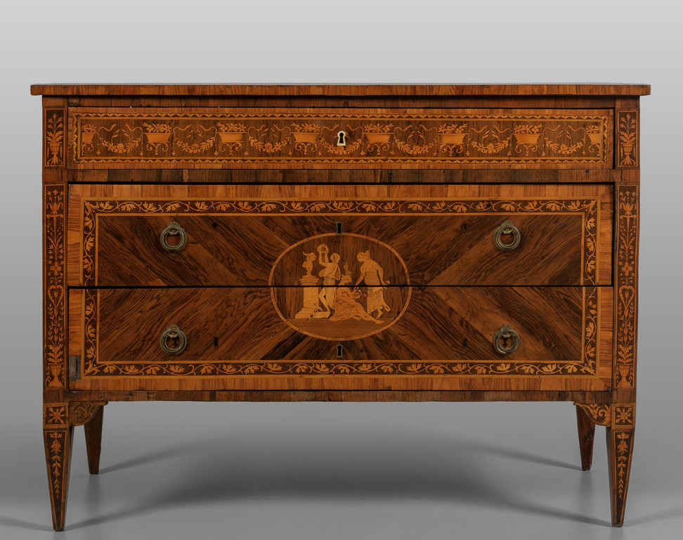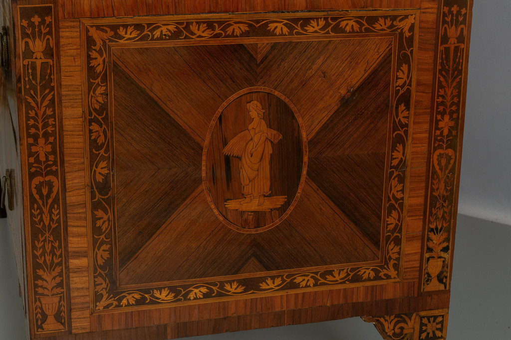 Comò Luigi XVI a due cassetti più uno lastronato ed intarsiato a motivi neoclassici piano in legno lastronato ed intarsiato Lombardia II metà sec.XVIII