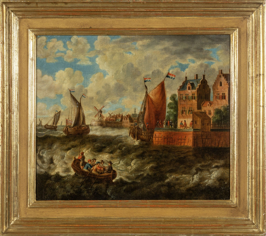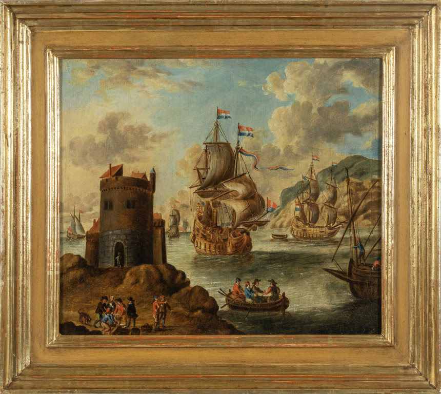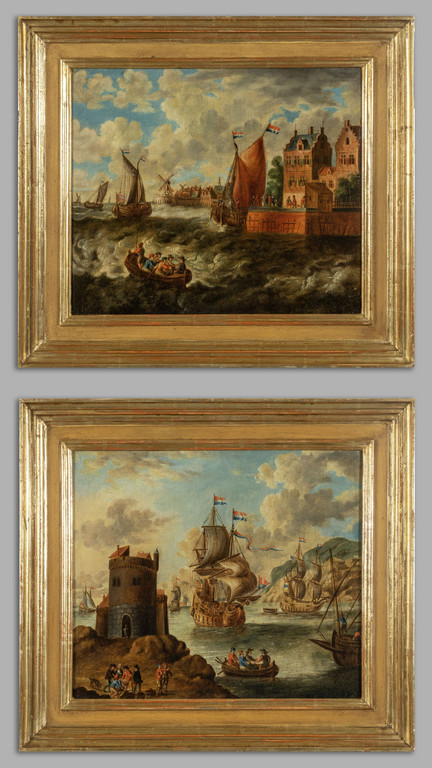 Scuola fiamminga sec.XVIII 'Paesaggi marini con figure e navi' coppia di olii