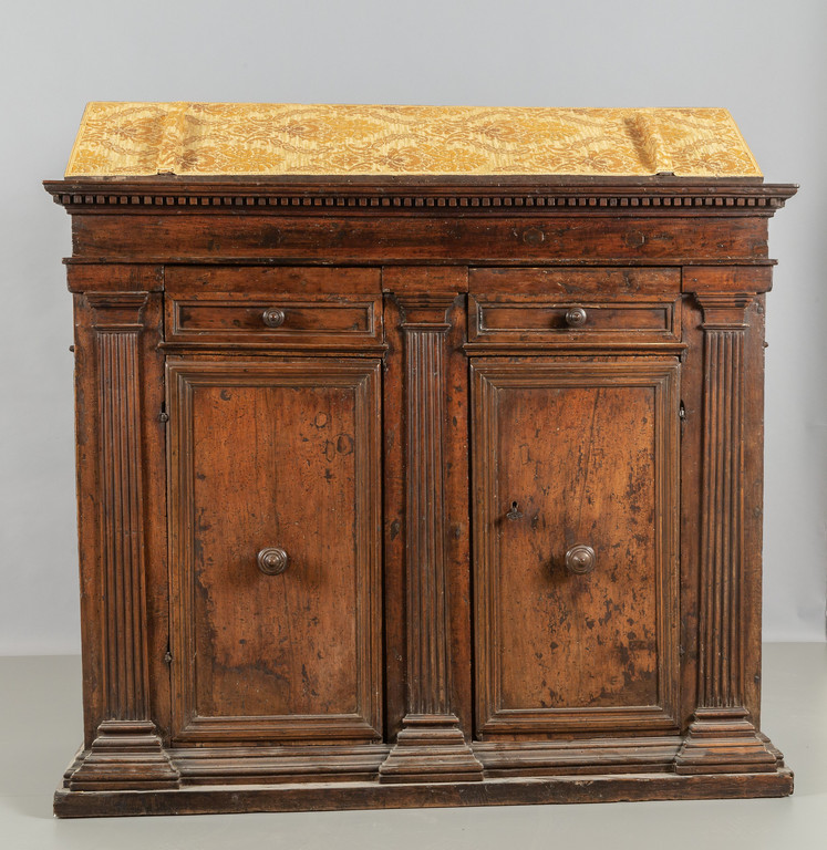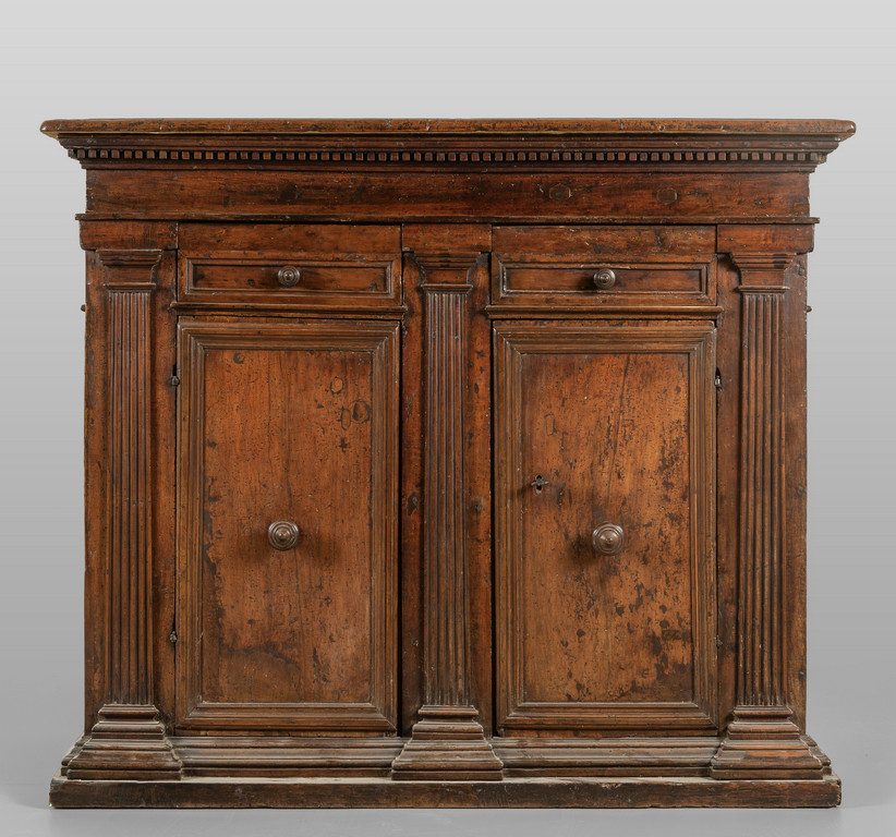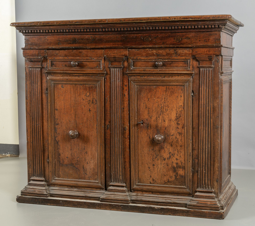 Credenza in noce a due sportelli e due cassetti piano superiore apribile Toscana sec.XVI