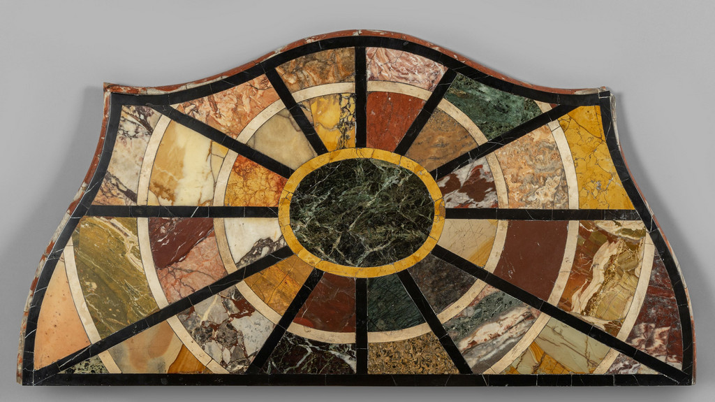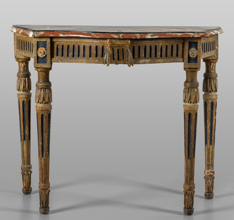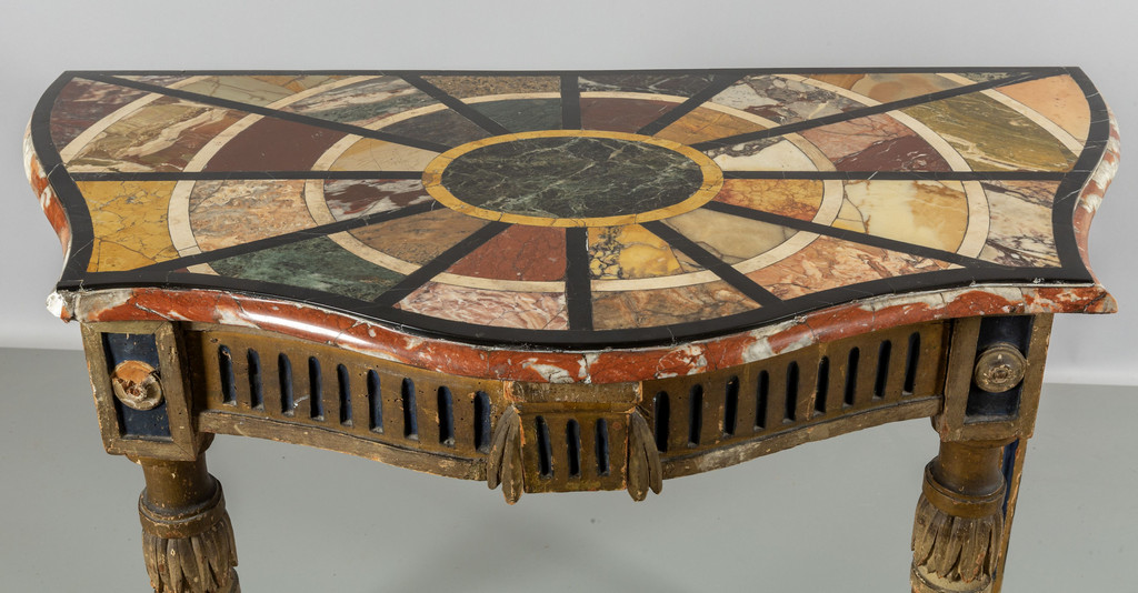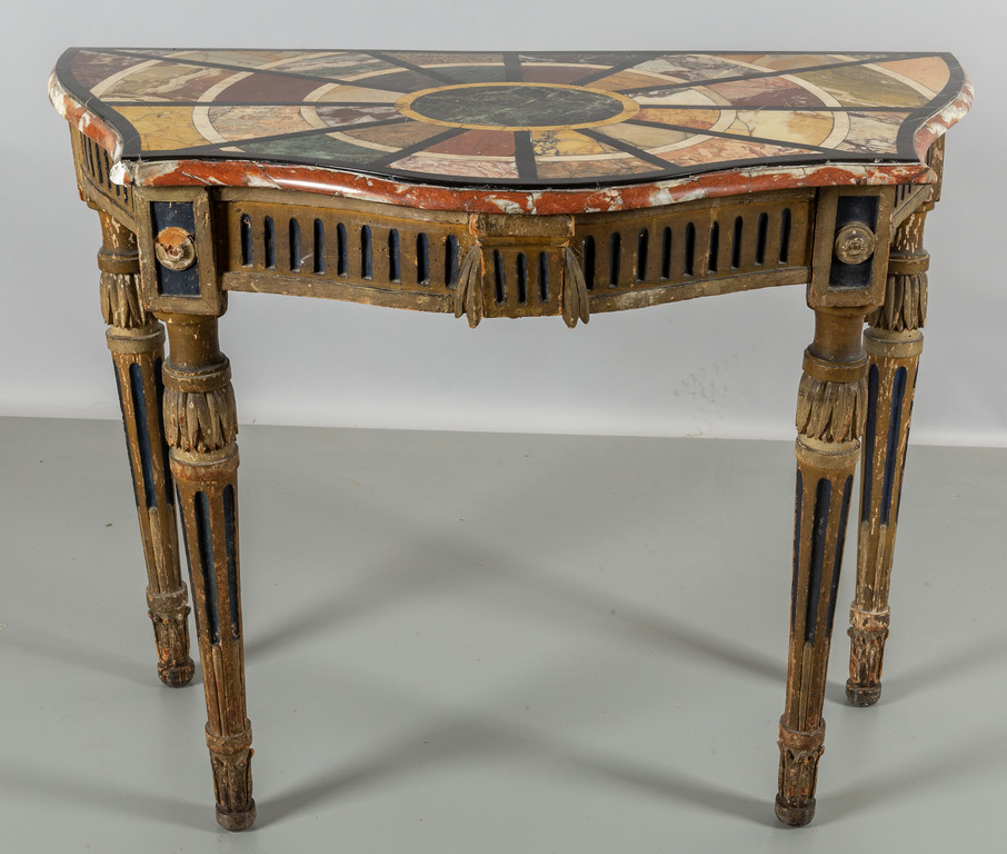 Consolina neoclassica in legno intagliato dorato e laccato importante piano intarsiato in marmi vari fine sec.XVIII