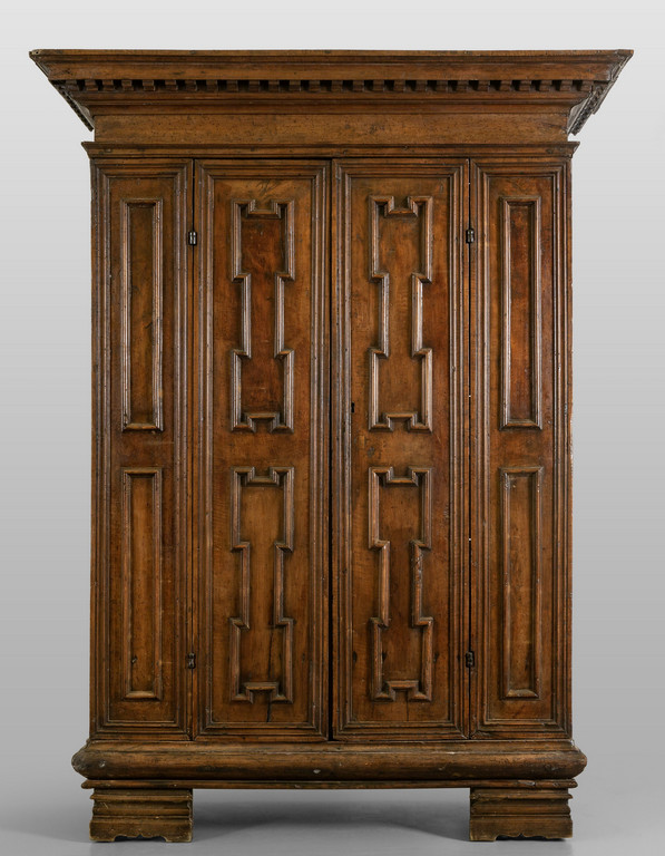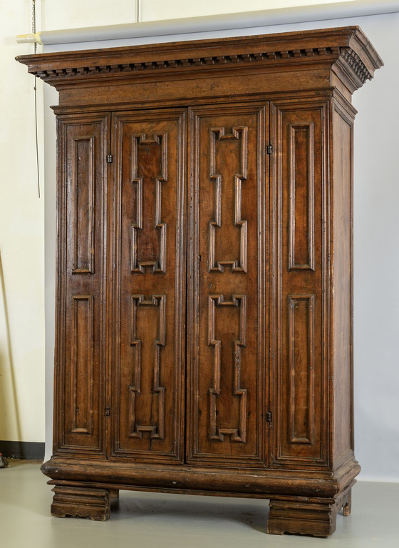 Armadio Luigi XIV a due ante in noce intagliato con formelle Lombardia inizi sec.XVIII