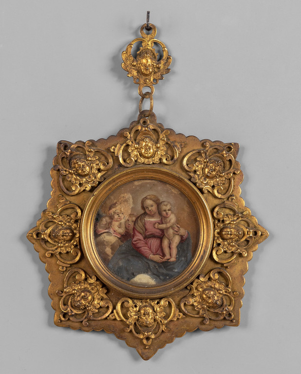 'Madonna con Bambino ed angeli' olio su rame sec.XVIII cornice coeva in rame dorato con testine di angeli