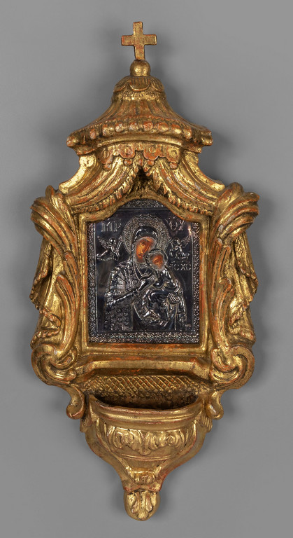 Acquasantiera in legno intagliato e dorato sec.XVIII all'interno icona con riza in argento raffigurante la Madonna con il Bambino