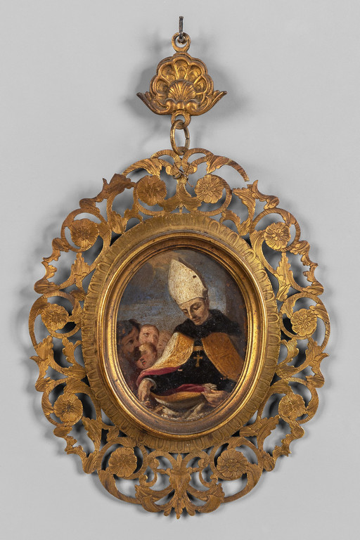 'Santo Vescovo con figure' olio su rame di forma ovale sec.XVIII cornice in rame dorato