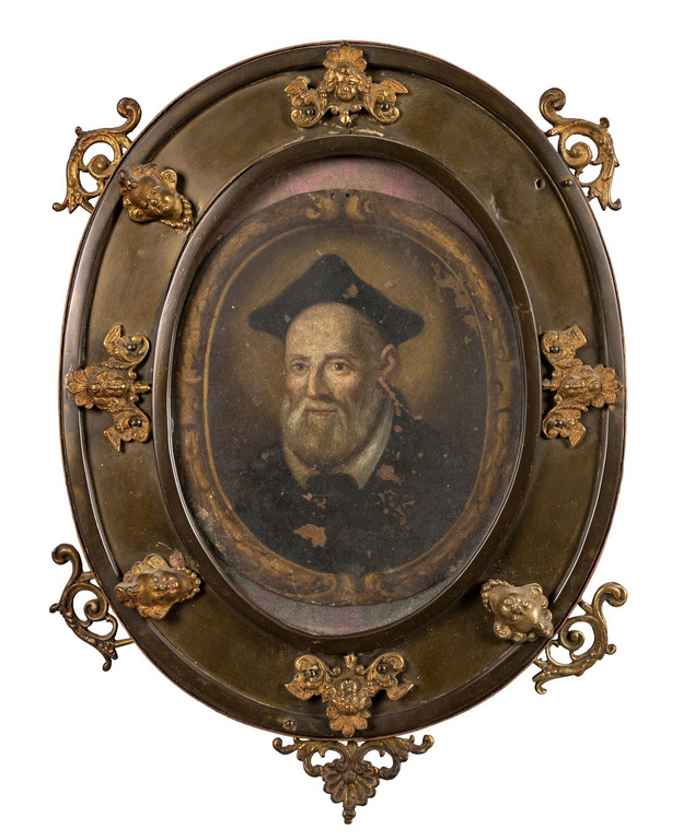 'Ritratto di prelato' olio su rame di forma ovale sec.XVIII cornice in metallo e bronzo non coeva con testine di angeli in bronzo dorato