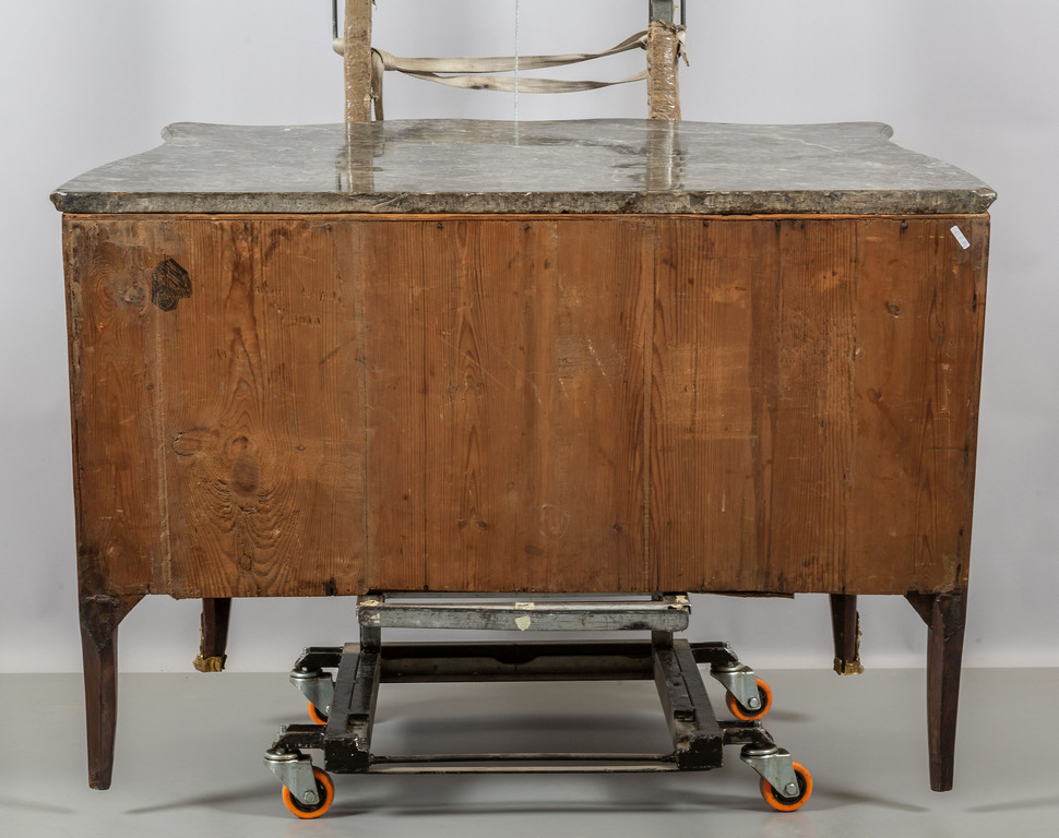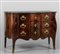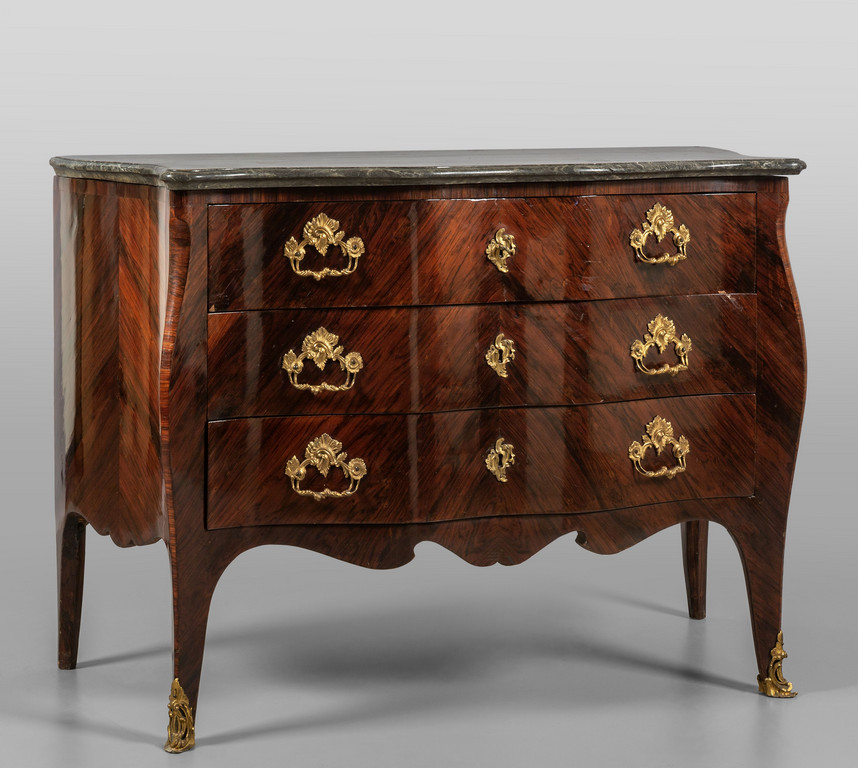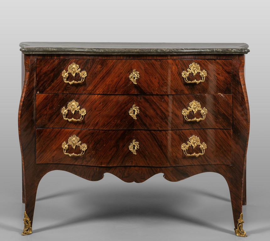 Comò Luigi XIV a tre cassetti con doppia mossa sul fronte alette incorporate fianchi mossi lastronato in legno di viola ricca decorazione in bronzo dorato collezione Mario Panzano Genova I metà sec.XVIII