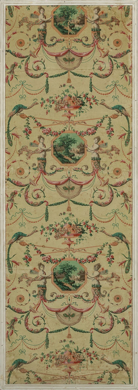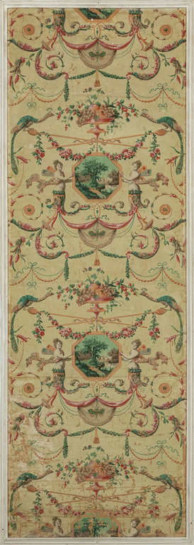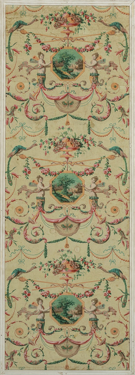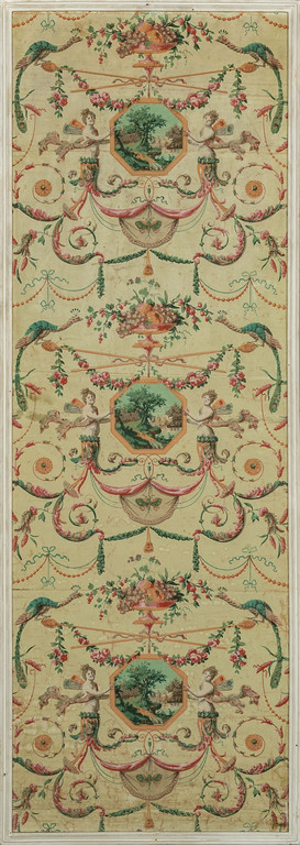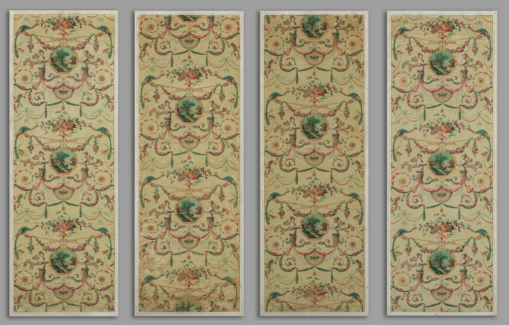 Quattro pannelli decorati in policromia a grottesche con al centro piccoli paesaggi carta su faesite Francia II metà sec.XVIII
