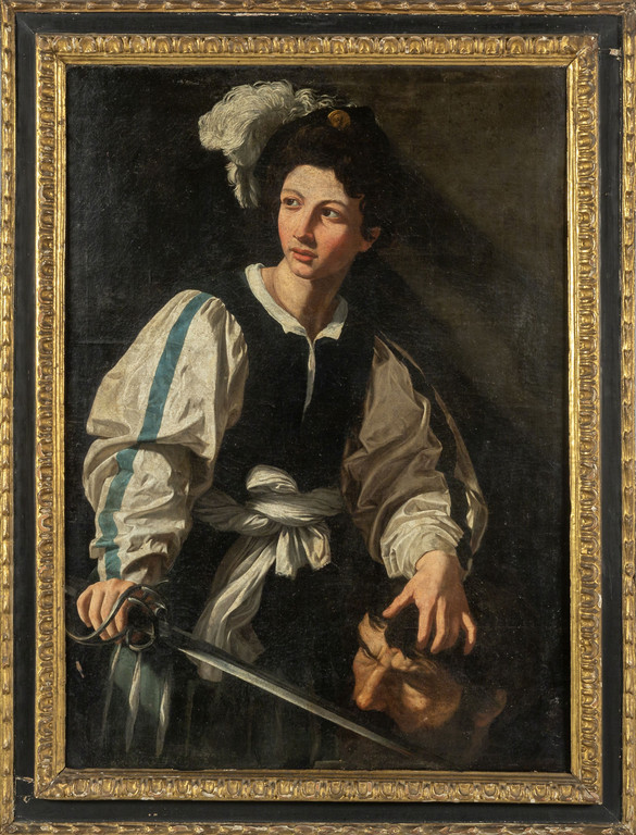 Scuola napoletana sec.XVII 'Davide e Golia' olio cornice coeva in legno ebanizzato ed oro
