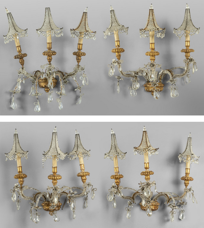 Quattro grandi bracci a tre luci in legno intagliato e dorato ricca decorazione in cristallo Genova II metà sec.XVIII