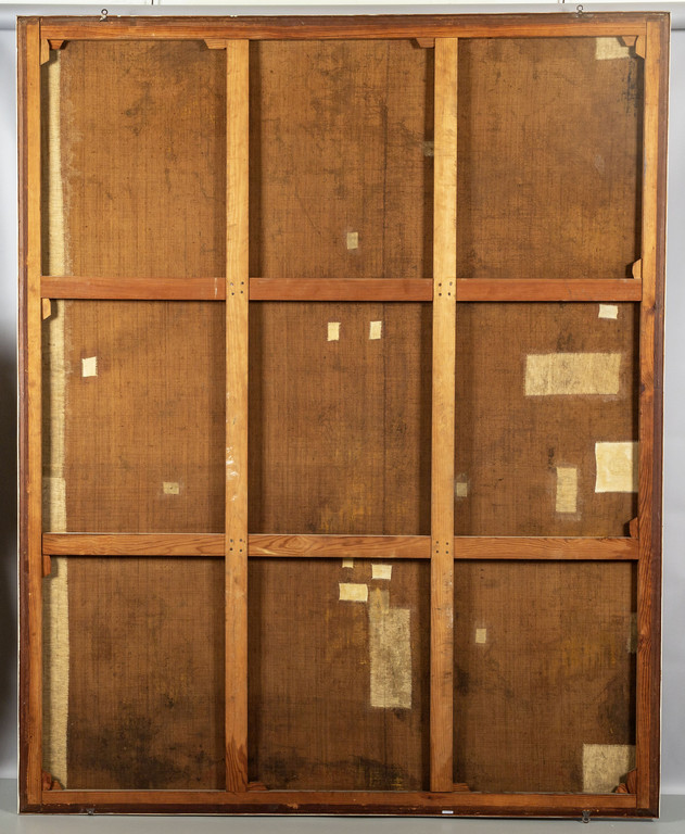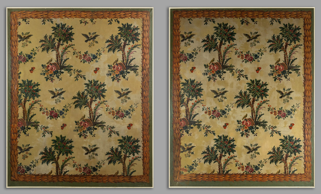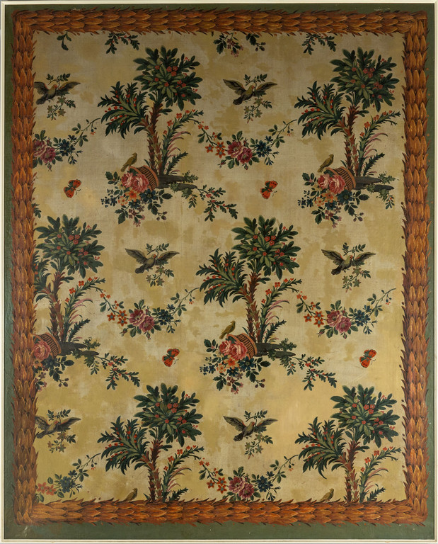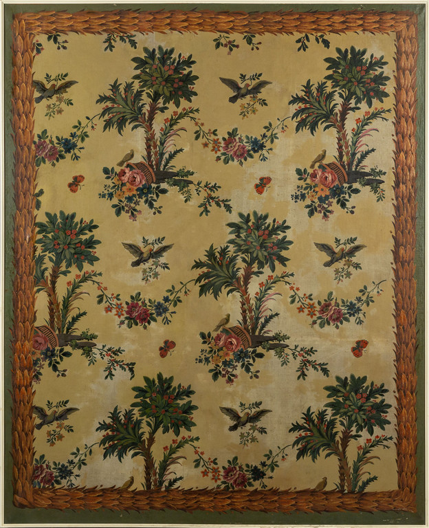 Coppia di grandi pannelli dipinti a motivi di fiori palme e volatili I metà sec.XIX