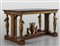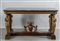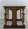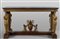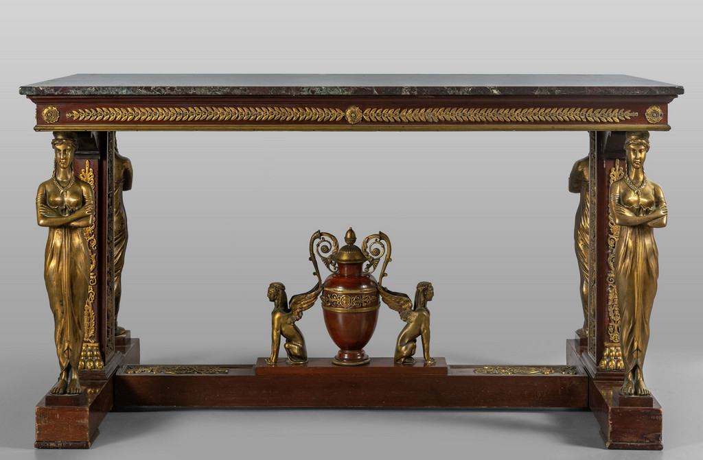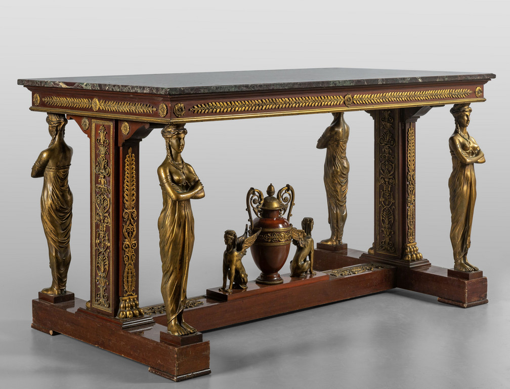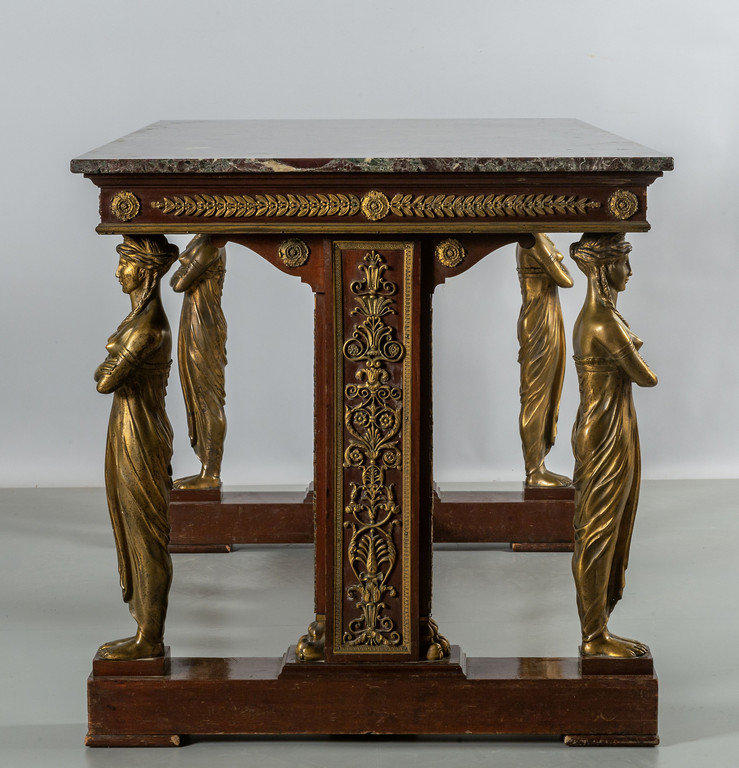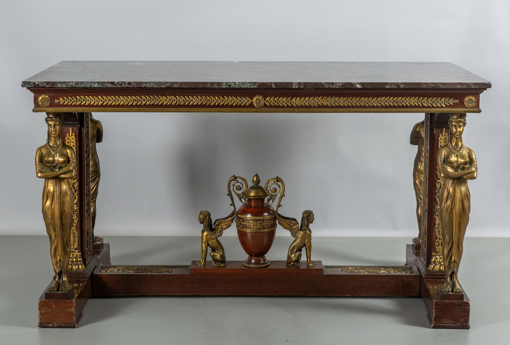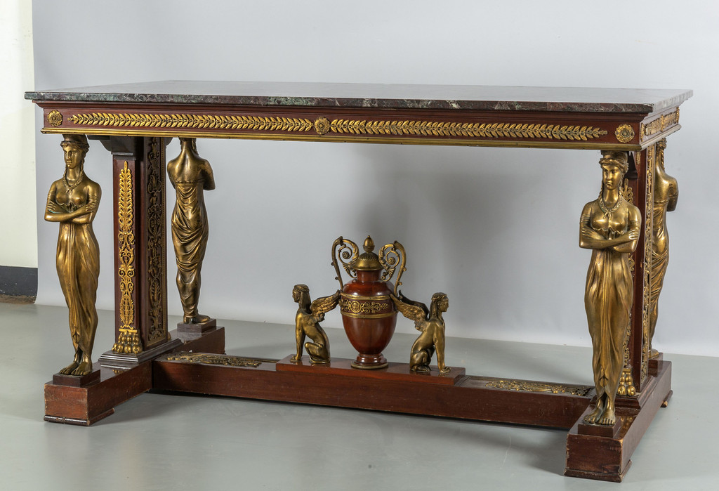 Tavolo da centro in stile Impero piano sostenuto da quattro figure in bronzo al centro montante con ricca decorazione in bronzo parte inferiore con traversa decorata al centro con vaso sorretto da due sfingi piano in marmo Francia fine sec.XIX