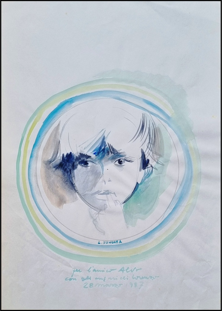 D'ANDREA LORENZO Lucca 1943 "Volto di fanciulla" Acquerello su carta cm 34x48 del 1987. Firmato e dedicato in basso al centro.