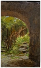BIANCHI LUIGI Milano 1827 - 1914 "Arcata con scalinata" Olio su cartone cm 10,4x16. Reca al verso timbro eredi Luigi Bianchi per autenticità.