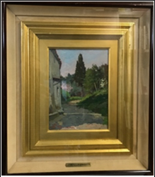 LUPERINI FIORENZO Livorno 1945 "Sentiero con casolare" Olio su cartone telato cm 18x23,5. Firmato sul fronte in basso a sinistra. Sul firma e titolo.