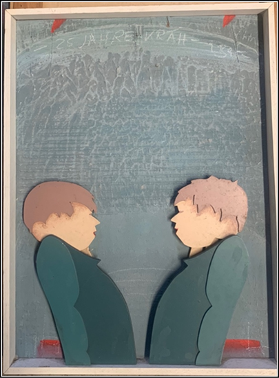BERNSAU LUTZ Germania 1954 "Personaggi" Sovrapposizione di elementi sagomati su tavola cm 40x50. Firmato sul fronte in basso a destra, annotazioni in alto.