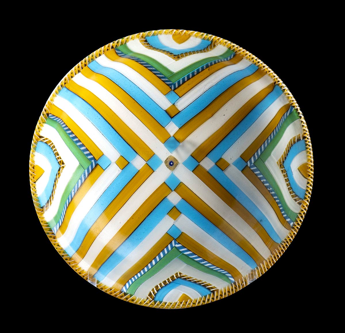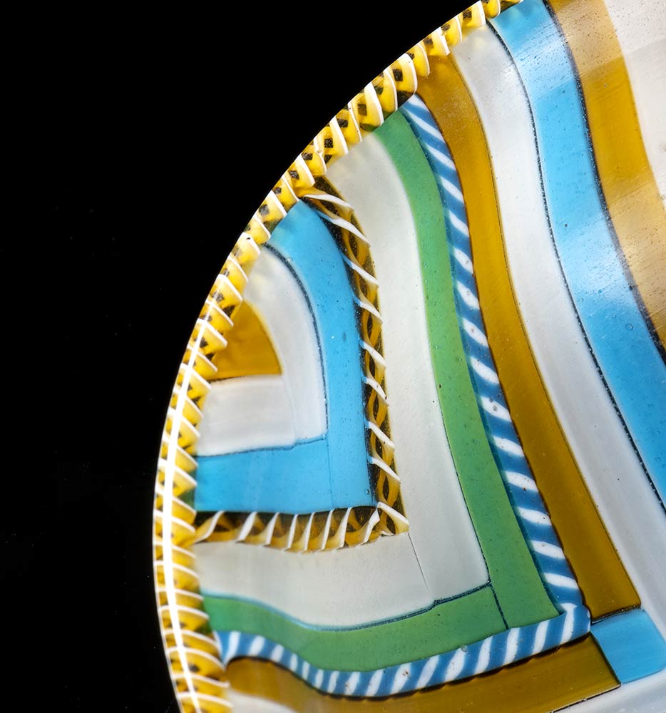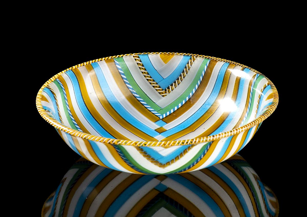 Manufatto in vetro mosaico a nastri policromi e canne a retortoli, bordo a canna ritorta