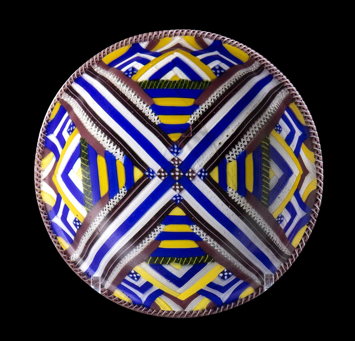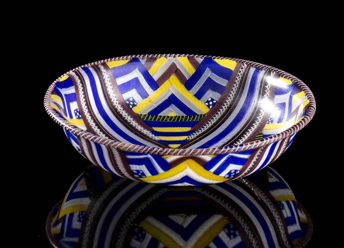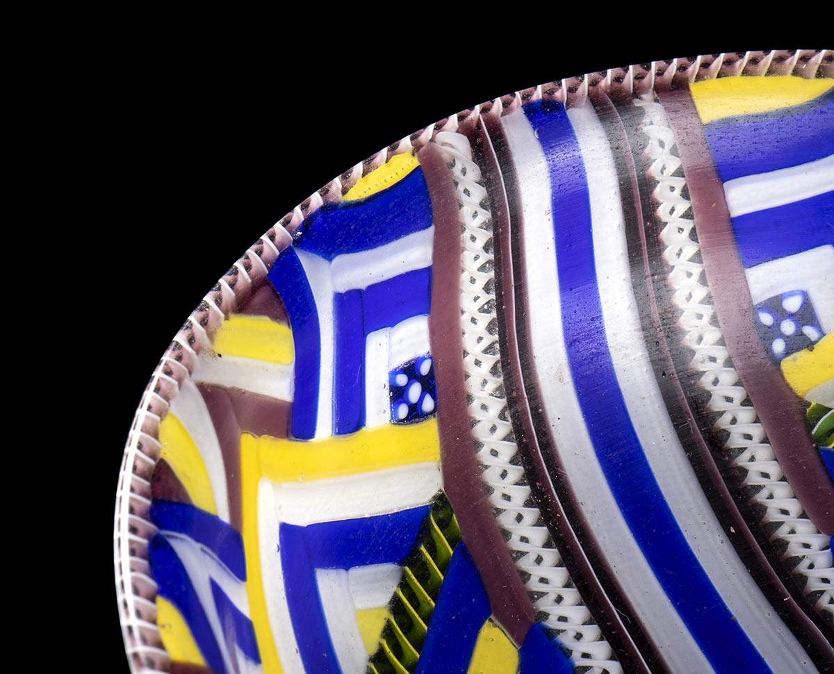 Manufatto in vetro mosaico a nastri policromi incrociati e canne a retortoli, bordo a canna ritorta