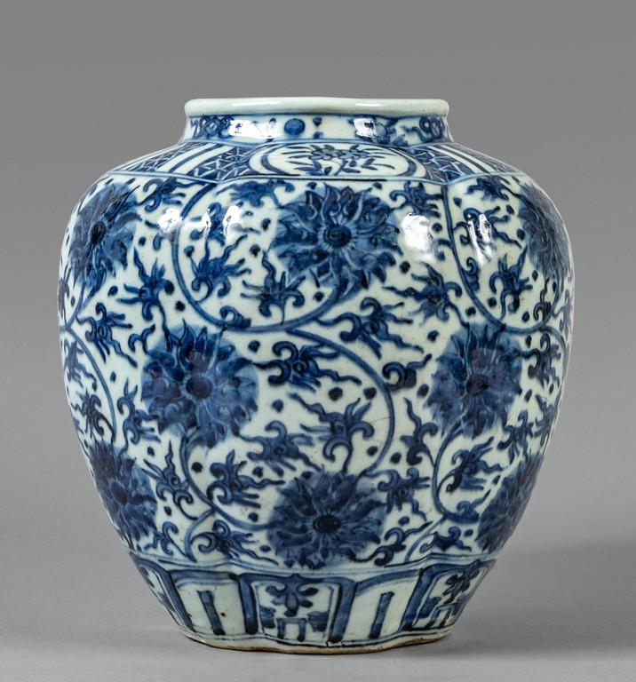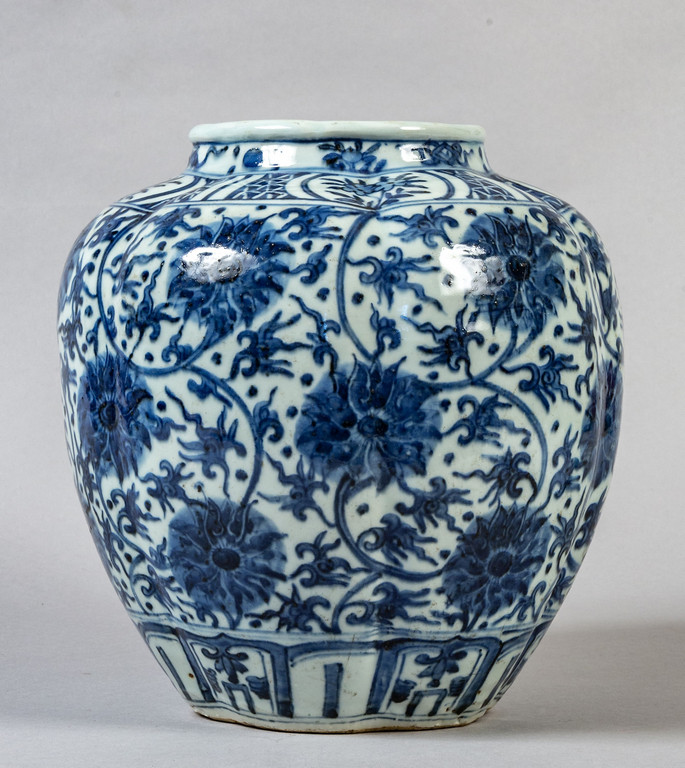 Vaso in porcellana con corpo costolato decoro bianco e blu a fiori Cina sec.XIX