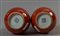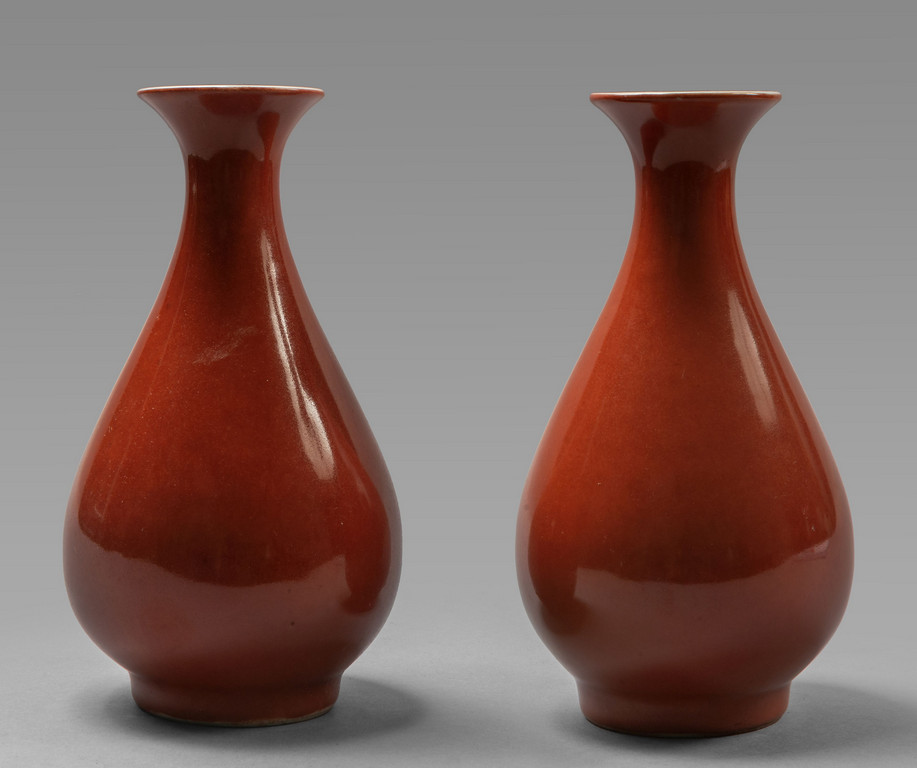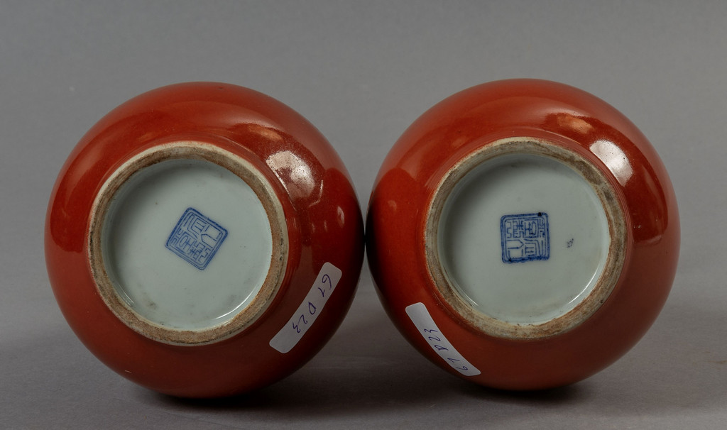 Coppia di vasi in porcellana di forma piriforme decorati in rosso marcati alla base Cina inizi sec.XX