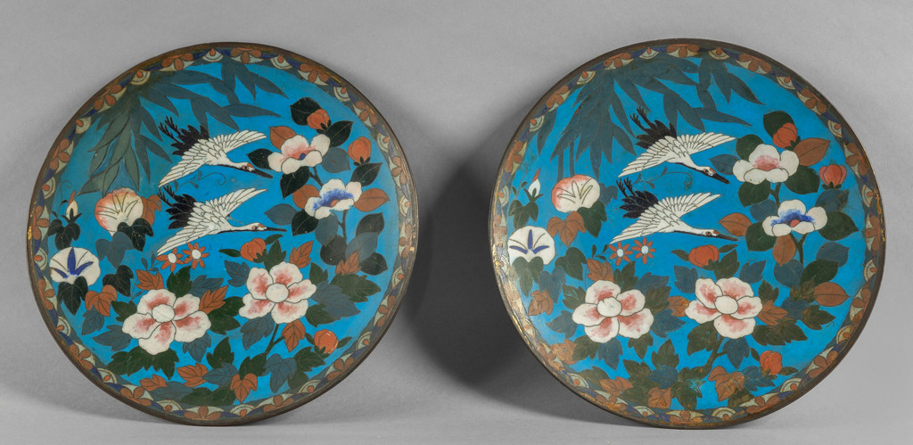 Coppia di piatti cloisonnè con fiori ed arioni sec.XX