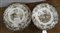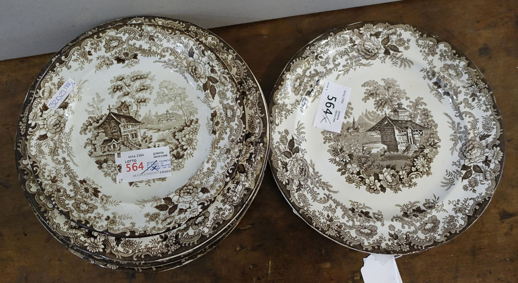 Servizio incompleto di piatti in terraglia decorati a paesaggi con case in marrone su fondo bianco composto da: 30 piatti piani 14 fondi 10 frutta cioccolatiera 4 coppette 2 piatti da portata ovali 1 con bordo sagomato e risottiera