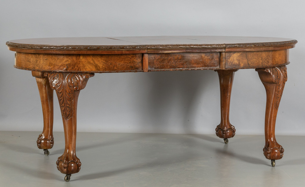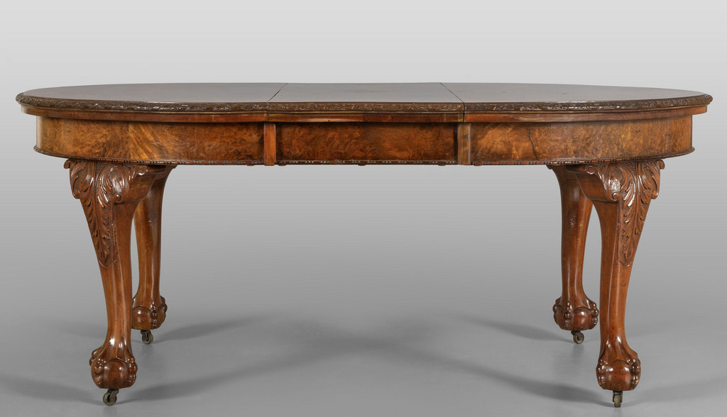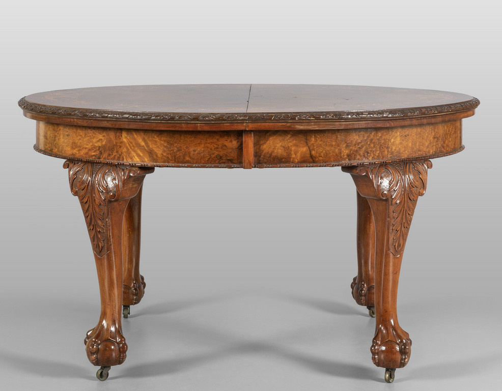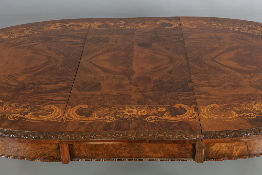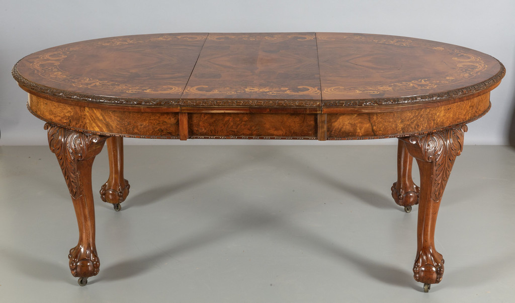 Tavolo da pranzo allungabile a manovella con una prolunga originale (cm.45) di forma ovale lastronato in radica e finemente intarsiato a motivi floreali Inghilterra sec.XIX