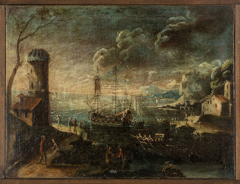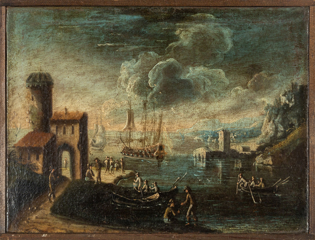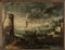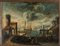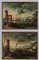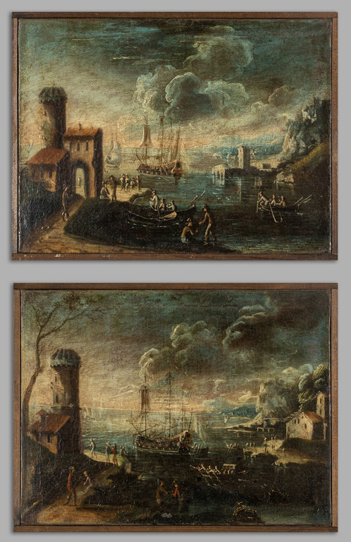 Scuola italiana sec.XVIII 'Vedute di porto con galeoni e personaggi' coppia di olii