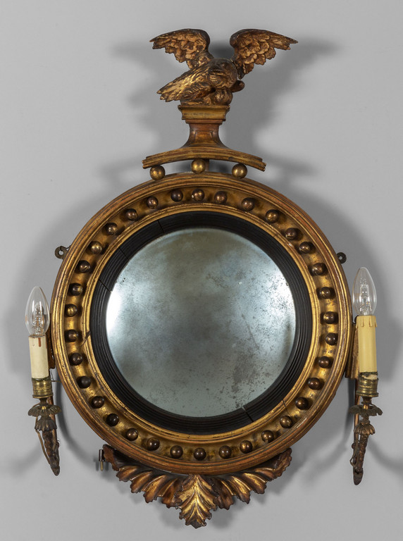 Specchiera in legno intagliato e dorato sormontata da aquila con due bracci portaluce Inghilterra sec.XIX