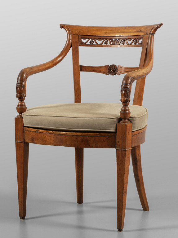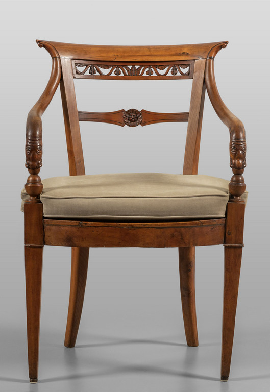 Poltrona Direttorio in noce con braccioli scolpiti a motivi di serpentelli alati Genova sec.XIX