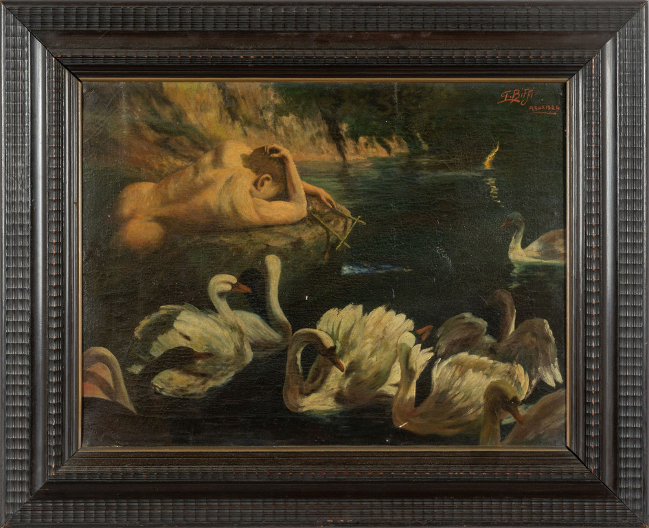 Precedente Lotto 0648 Successivo Aste Boetto - Via Mura dello Zerbino 10R, 16122 Genova Asta di Antiquariato e Arte Orientale Asta di Antiquariato e Arte Orientale mercoledì 21 giugno 2023 ore 10:00 (UTC +01:00) DIPINTO 'Narciso tra i cigni' olio d.to 1924cm. 80x60