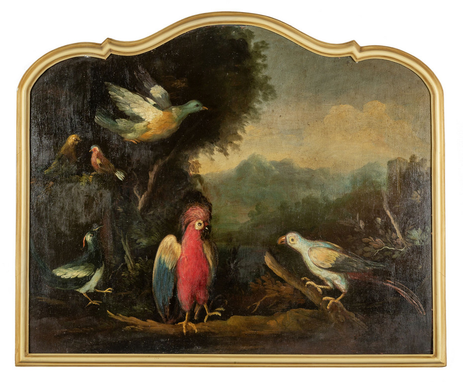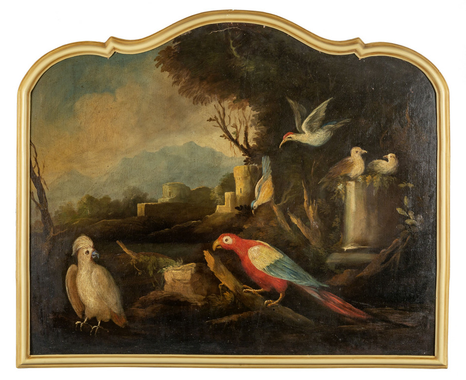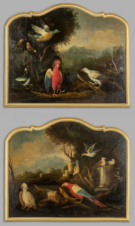 'Paesaggi con uccelli' coppia di olii parte superiore sagomata sec.XX