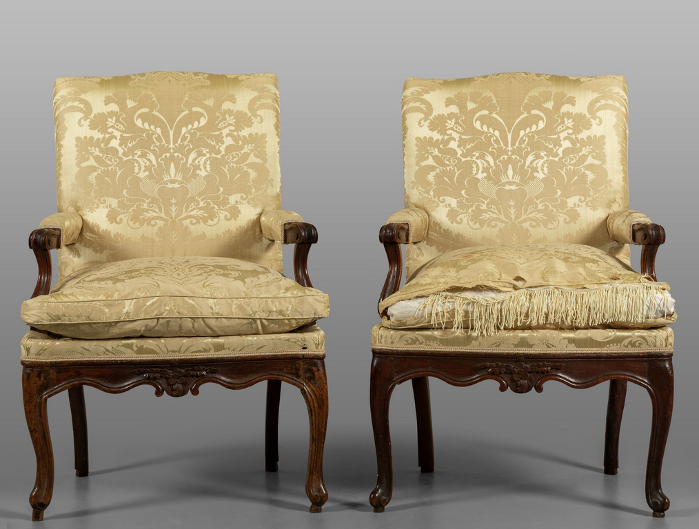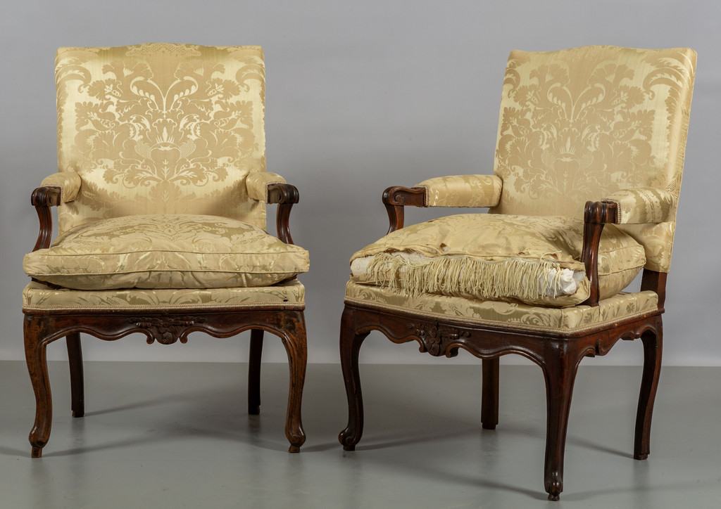 Coppia di poltrone Luigi XIV in noce fascia frontale scolpita Piemonte sec.XVIII